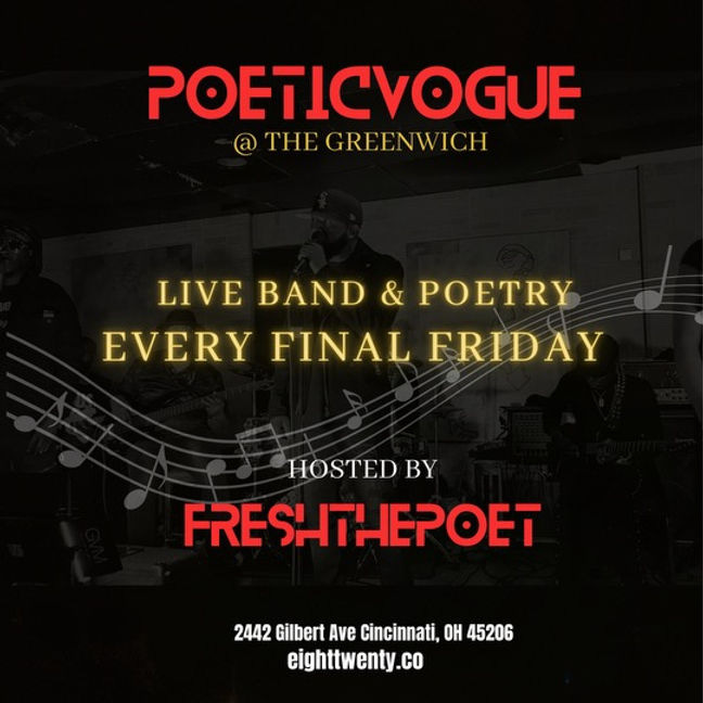 Step into the rhythm of Poetic Vogue — an unforgettable night of spoken word, soul, and unapologetic expression at The Greenwich on Every Final Friday