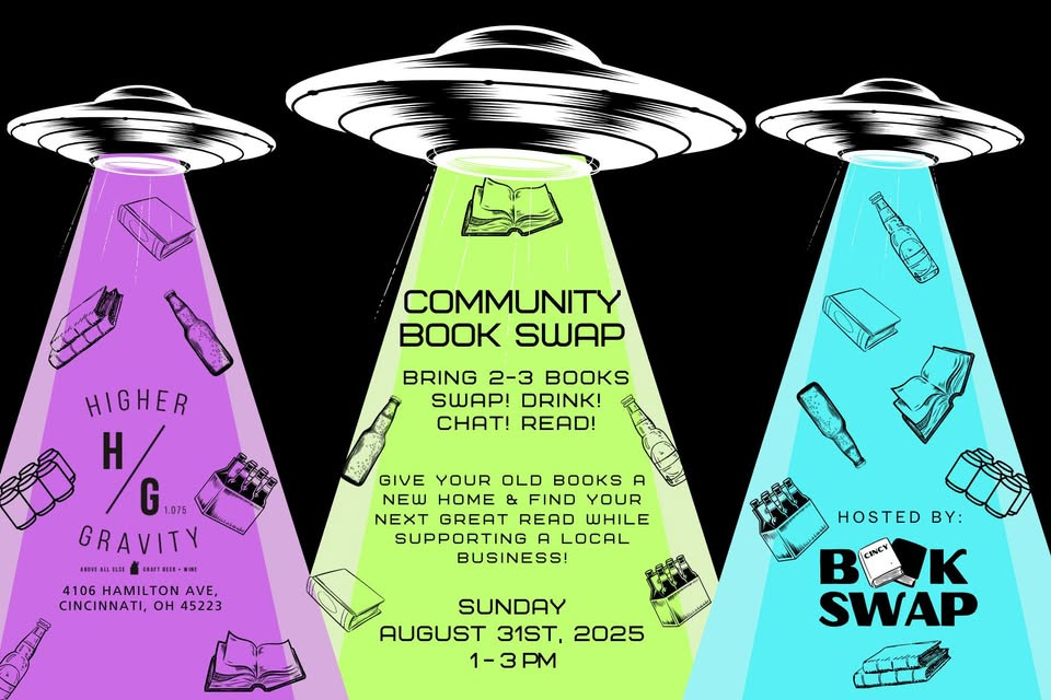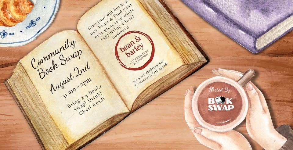 Cincy Book Swap is a community gathering for any and all readers who have books they would like to swap with other readers to find their new favorite book. Bring 2-3 books to swap with others. Fiction, Fantasy, Romance, History, whatever your genre, bring it and find others while getting to know fellow bibliophiles and supporting a local business.